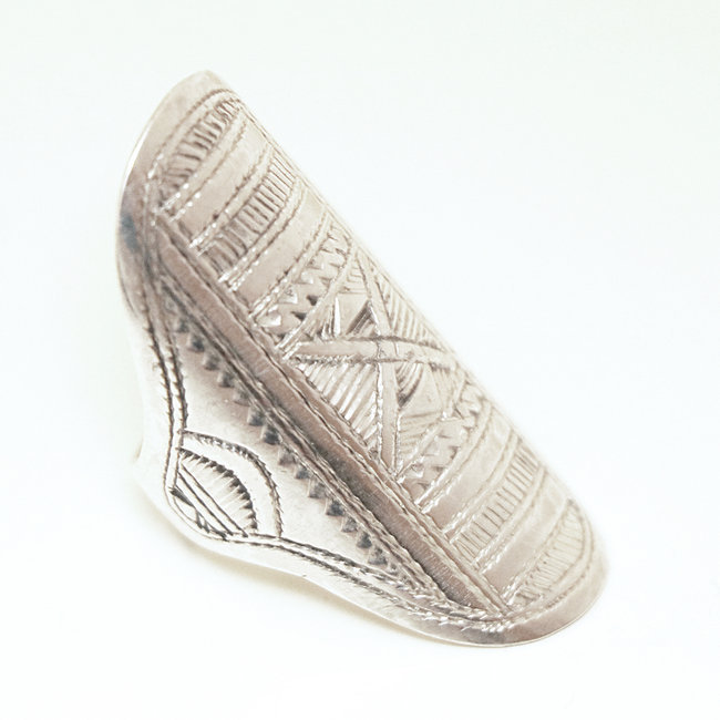Longue bague en argent massif 925 aux gravures finement travaillées.
