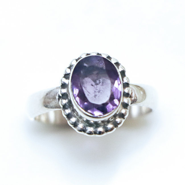 Bague en argent munie d'une pierre d'Améthyste réalisée par des artisans en Inde.