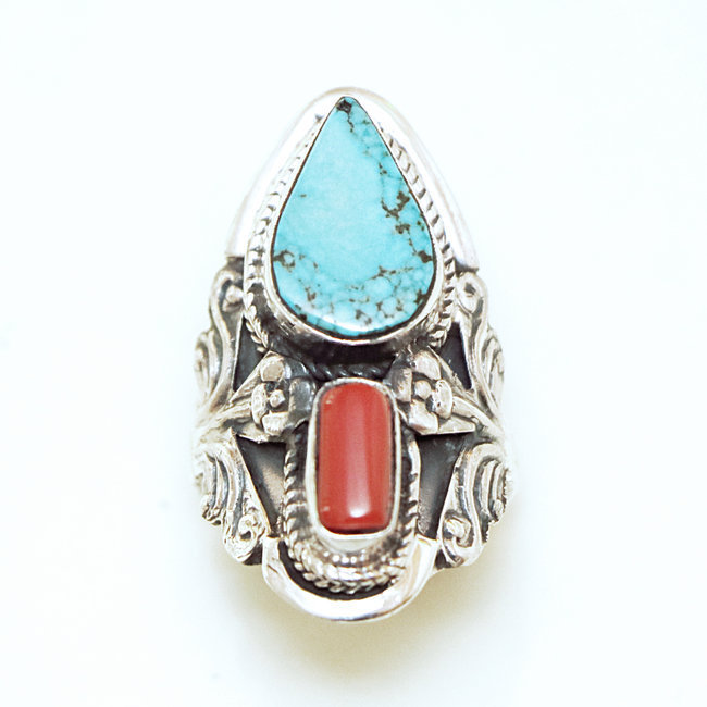 Bague népalaise en argent et pierres fines de Corail et Turquoise véritables.