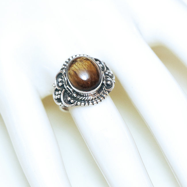 Bague avec de jolis filigranes, en argent et pierre fine d'Oeil de Tigre.