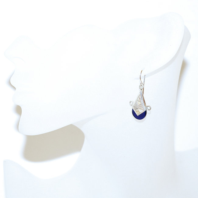 Boucles d'oreilles touareg réalisées en argent, avec un verre artisanal bleu.