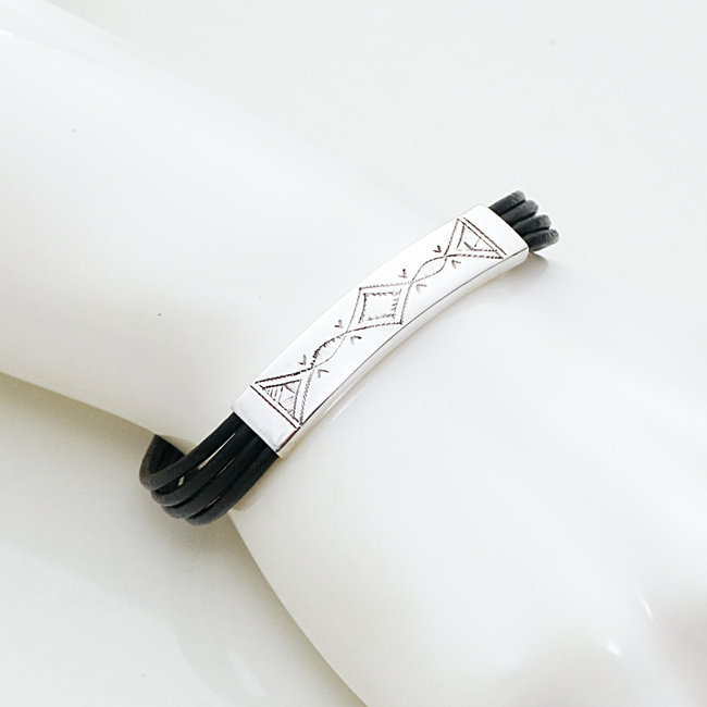 Bracelet réalisé par des artisans du Niger en argent avec cordon en cuir noir. Fermoir en argent massif 925.