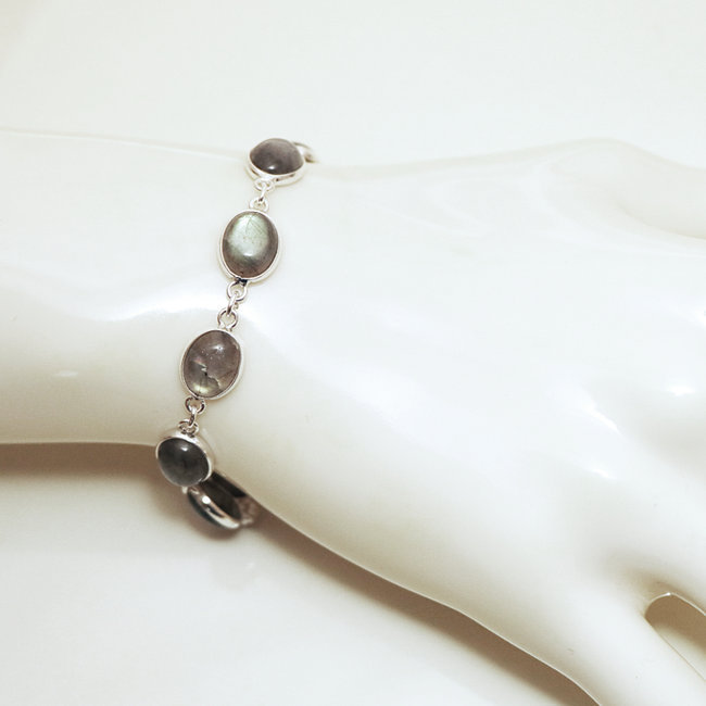 Bracelet indien en argent avec des pierres fines de Labradorite. Ce bracelet est réglable grâce à sa chaînette de prolongement.