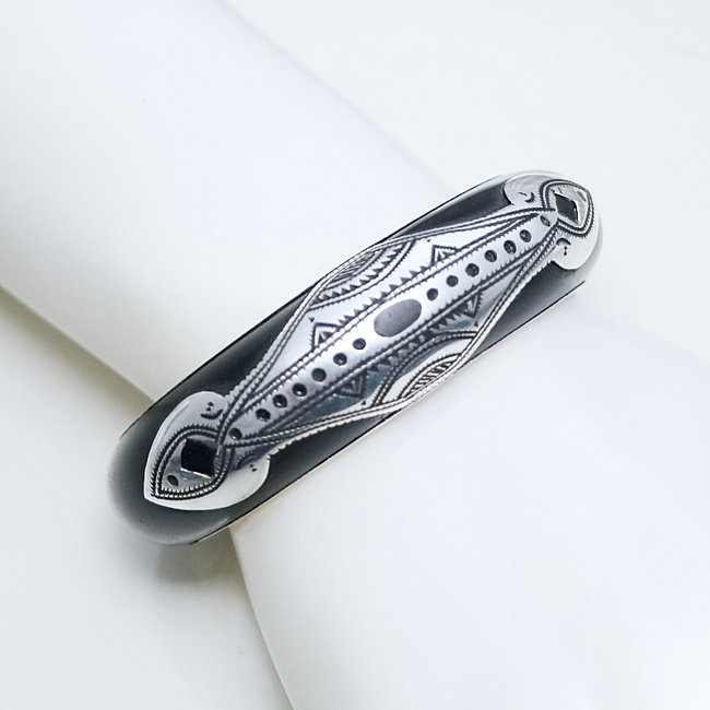 Bracelet rigide en argent massif 925 et ébène. Ce bracelet est travaillé finement grâce à ses minutieuses gravures.