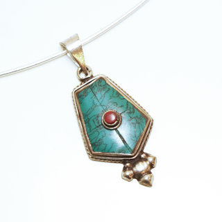 Bijoux Indiens Ethniques petit pendentif laiton plaqué argent 925 et pierre - Nepal 030 Turquoise et Agate rouge