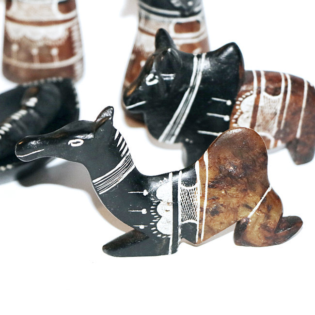 Dans cette pierre blanche sont sculptés les santons, puis l'artisan fume chaque santon au feu de bois pour lui donner cette couleur plus ou moins foncée et enfin il réalise des gravures reprenant les motifs typiques que l'on retrouve sur les bijoux touareg, faisant apparaître les sillons blancs de la pierre originale.